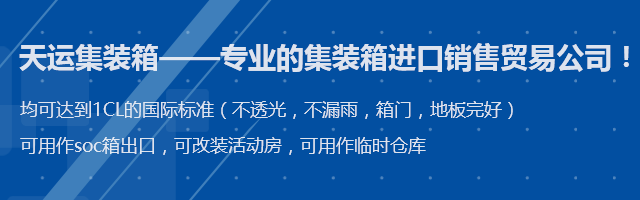 青島天運集裝箱服務有限公司,是專業(yè)的集裝箱進口銷售貿易公司,公司與各大船公司租箱公司保持著密切的合作關系,箱源充足,所有出售集裝箱均可達到IICL的國際標準(不透光,不漏雨,箱門,地板完好)可用作soc箱出口,可改裝活動房,可用作臨時倉庫。